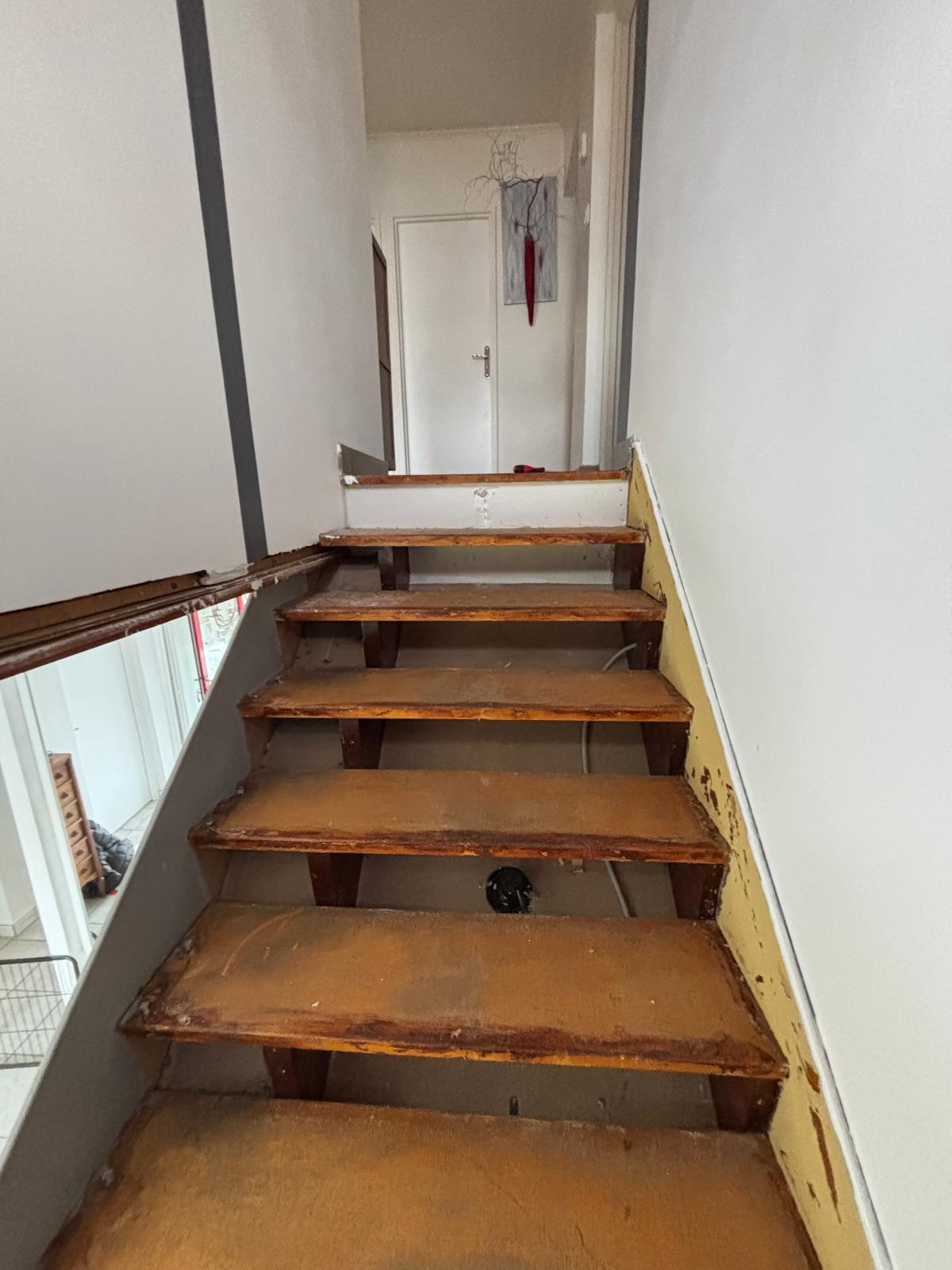- Dépose de la moquette : Dominique a enlevé la moquette ainsi que les contremarches, préparant ainsi l’escalier pour la nouvelle pose.