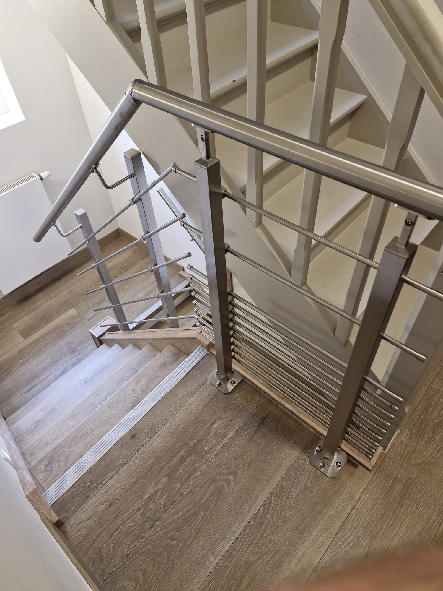 - Finitions soignées : Habillage blanc des poteaux et pose des nez de marche en peign.